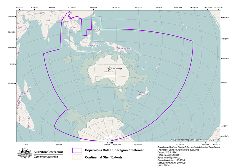 The Sentinel products cover a ROI over Australasia, South-East Asia, the South Pacific, the Indian Ocean and the Australian Antarctic Territory, as depicted in the map below.