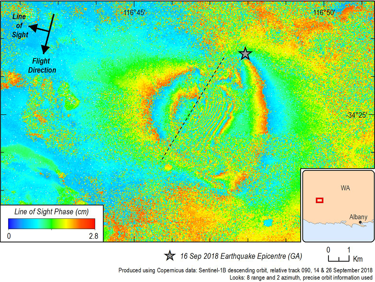 Challenge: Geoscience Australia monitors, analyses and reports on the occurrence of significant earthquakes within Australia and its territories. In September 2018, an earthquake of local magnitude 5.7 occurred in the Lake Muir region of WA. There was a large degree of location uncertainty with the seismic measurements, and it was difficult to locate where (or even if) any earthquake surface deformation had occurred. The InSAR Team was tasked with developing a more precise method of detecting surface deformations.